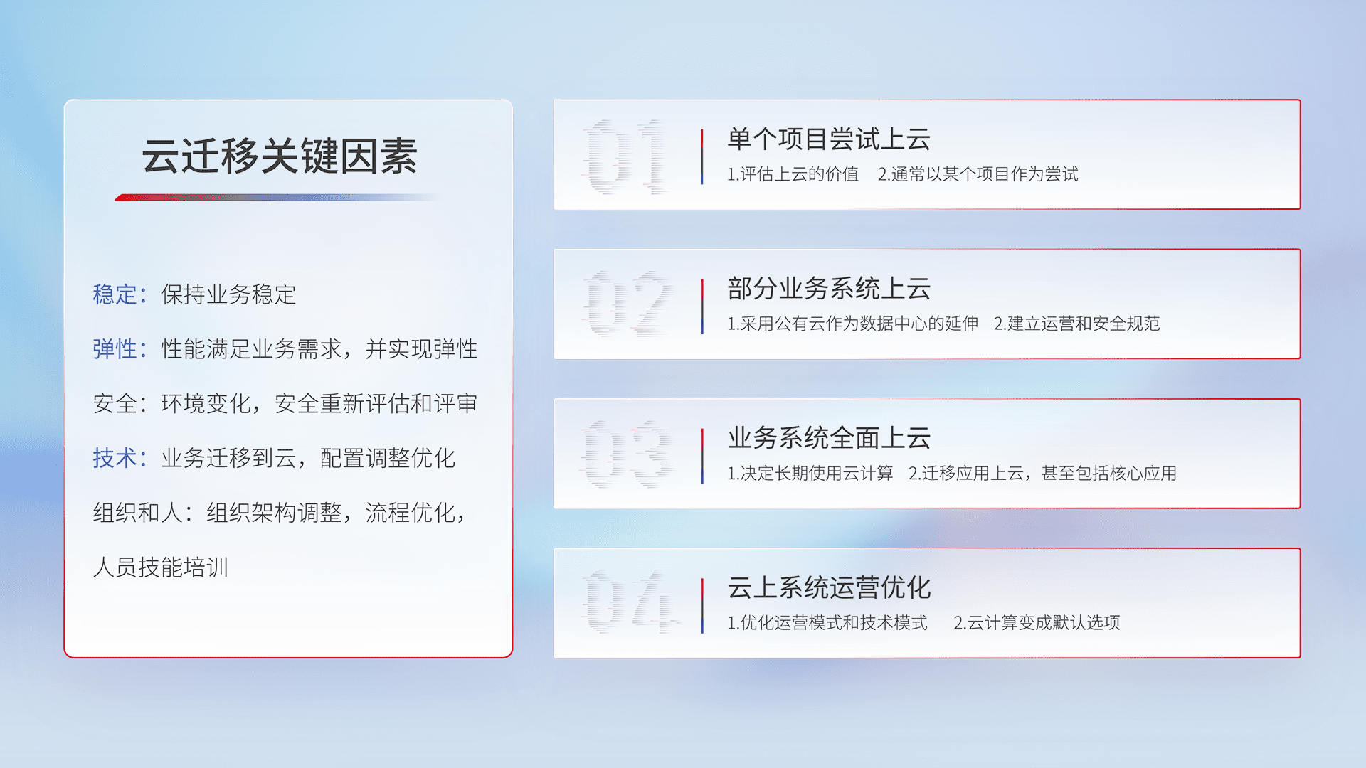结合实际业务,,,从规划设计、、、、云平台选型、、、、云原生改造、、、数据迁移、、、、集成交付,,迁移全过程为客户识别最佳上云路径,,,做好风险识别管理,,,,设计网络架构、、、身份权限、、安全审计合规、、、操作审计、、日志审计、、监控告警策略、、多站点容灾设计等,,对云上基础设施进行整体规划,,提升IT治理水平,,,,以满足弹性、、、、高可用、、、高性能的需求。。