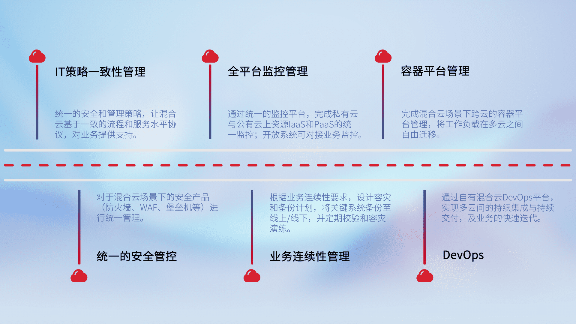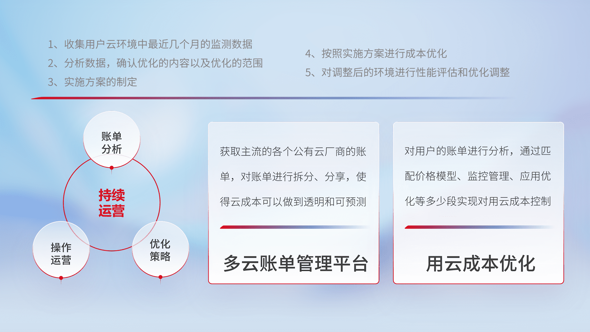 通过多云纳管,,,,以统一的资源数据模型把客户的云资源进行抽象和封装,,,进而实现对多云资源的统一操作,,,,保障云资源管理的可靠性、、、、稳定性与可用性。。量身定制化运维内容,,配置、、开发运维、、、、补丁管理、、、备份、、、、监控、、、认证和访问管理、、审计和日常巡检等,,保障在用云过程中的可靠度,,,,稳定度以及高可用率。。