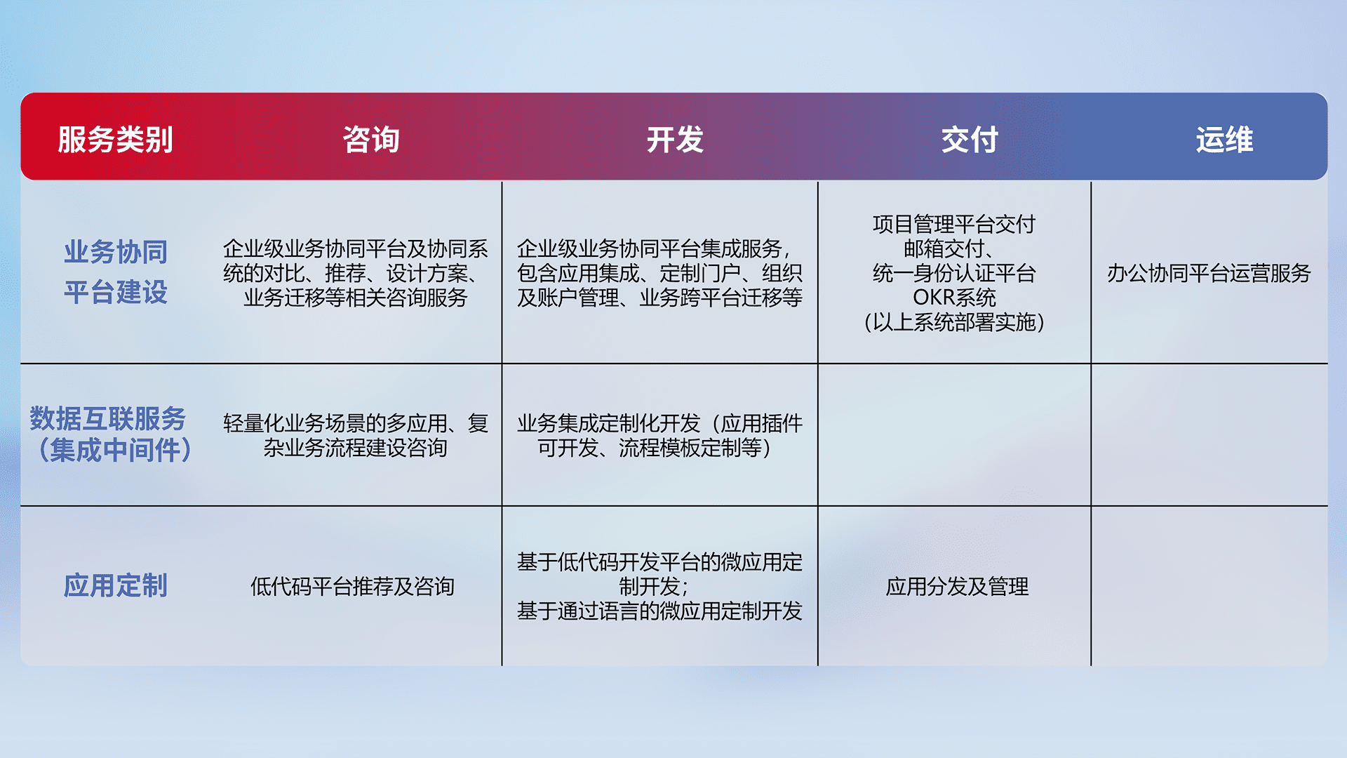 针对钉钉、、、企微、、IDaas等平台级产品提供产品的规划、、、、方案、、、、交付、、、定制化开发等服务,,实现如统一协同办公、、、智能客户服务、、、混合会议管理、、智能数据查询、、、等业务场景,,,,实现数字化转型。。。